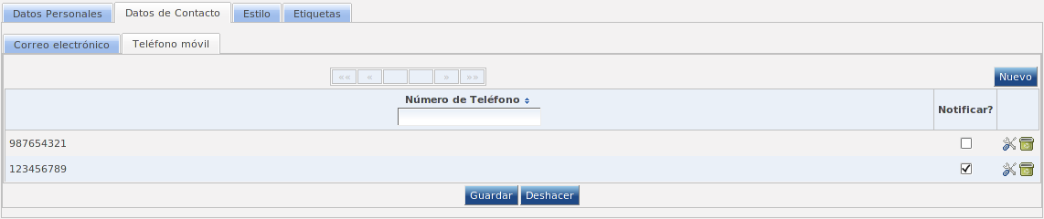 Podemos tener números de teléfono configurados aunque no queramos recibir notificaciones en ellos. La notificación se controla mediante el campo Notificar situado a la derecha.